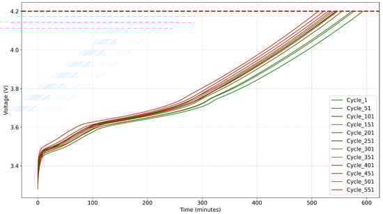 During the constant current charging phase, the focus is primarily on voltage variation since the charging current remains constant. The voltage behavior during constant current charging across different battery cycles is depicted in Figure 3. All voltage curves exhibit a rapid initial increase, followed by a gradual deceleration in the rate of growth.