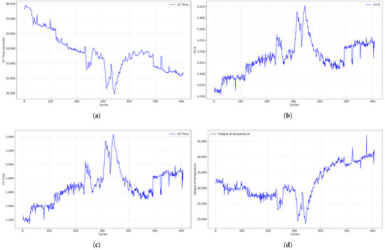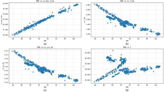 Related papers have indicated that the SOH of lithium batteries is significantly influenced by environmental temperature. Therefore, this study also incorporated the integral temperature obtained during the constant-voltage charging stage as a temperature-related feature. Figure 6d shows the graph of the integral temperature across the battery charging cycles during the constant-voltage charging phase. Although the linear correlation between battery SOH and temperature integration is not very apparent, as observed in Figure 6d, further analysis reveals a certain nonlinear relationship between them. This suggests that temperature may impact battery SOH not only through direct linear effects but also via more complex mechanisms affecting the aging process. While temperature integration alone might not directly linearly predict SOH, its combined analysis with other features can offer a more comprehensive assessment of battery health.