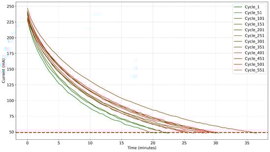 In the constant-voltage charging stage, where the charging voltage remains constant, the focus is primarily on the current variation. The constant-voltage charging current across different battery charging cycles is depicted in Figure 5. All current curves exhibit a rapid initial decrease, followed by a gradual deceleration in the rate of decline.