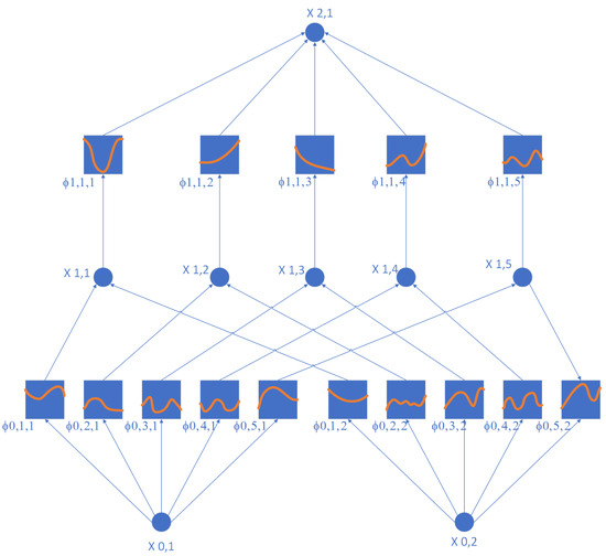 In the KAN layer, the input X is processed through a set of learnable B-spline activation functions and , which are then summed at the nodes. The output of the KAN layer is stated as follows: