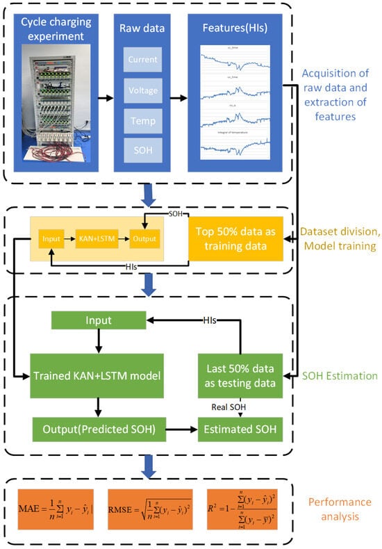 Given the strengths and limitations of current data-driven methods, we propose a novel approach that combines Kolmogorov–Arnold Networks (KAN) with the Long Short-Term Memory (LSTM) algorithm for lithium battery State of Health (SOH) estimation. The KAN component is utilized for its capability to effectively map complex, nonlinear relationships, while the LSTM algorithm excels at capturing long-term dependencies in sequential data. By integrating these two methods, the approach enhances feature extraction and temporal pattern recognition, resulting in a significant improvement in SOH estimation accuracy. The main contributions of this paper are summarized as follows.