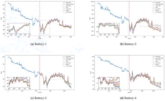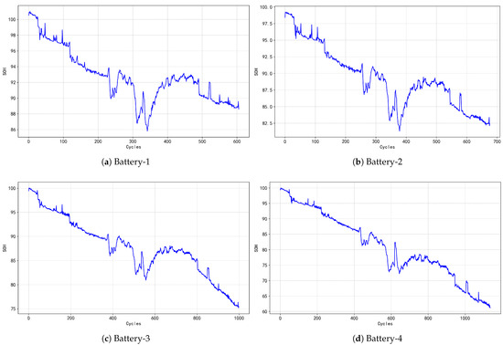 The graph of the SOH of the four batteries as a function of the number of charging cycles is shown in Figure 10. Each subfigure illustrates the process where the battery starts at nearly 100% SOH and gradually decreases during the charge and discharge cycles, exhibiting varying degrees of fluctuation and a downward trend. The first battery experienced a sharp decline in the middle of the cycle, followed by a slight recovery and then a slow decline. The second battery exhibited several significant drops and recoveries, ultimately reducing its SOH to around 82%. The SOH of the third battery decreased from 100% to below 75%, with the overall decline being relatively gradual. In contrast, the fourth battery showed a consistent downward trend over multiple cycles, eventually falling below 75%. The large fluctuations in these curves may be attributed to seasonal factors, where certain conditions cause the battery to endure significant load or stress, leading to capacity decline and subsequent recovery.