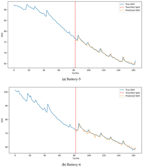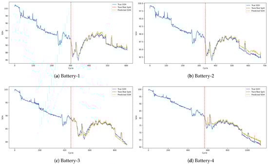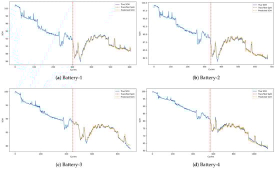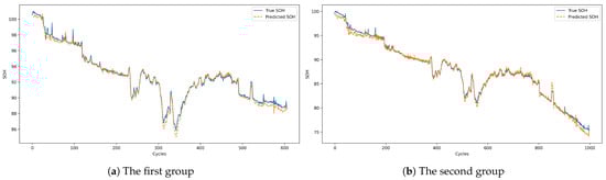 The evaluation results, summarized in Table 10, demonstrate robust predictive performance across both groups. The R-squared values consistently exceed 98%, indicating a strong correlation between the predicted and actual SOH values. Moreover, the MAE values are all below 0.2, and the RMSE values remain under 0.2, highlighting the accuracy and reliability of the model in cross-battery prediction scenarios. These results underscore the model’s capability to generalize effectively across different batteries with similar charging parameters.