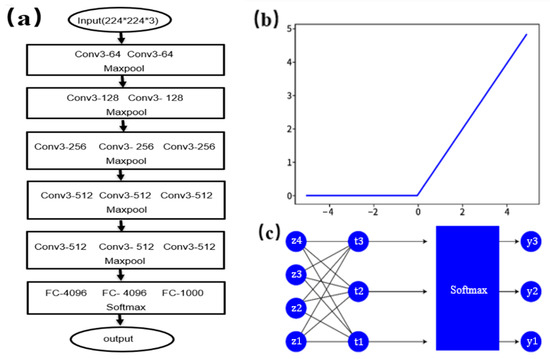 Components of predictive model: (a) VGG16 network structure, (b) ReLU activation function, and (c) Softmax activation function.