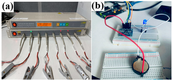 This study involves three scenarios of battery aging tests and loading experiments. Figure 3a shows the setup for the battery aging experiment, which applies forced load from the battery aging device to rapidly cycle the battery through charge and discharge processes. Figure 3b illustrates the setup for the battery loading experiment, where the battery is discharged using an LED load in a real-world external environment until it is fully discharged, followed by recharging. Both experiments were conducted in a room-temperature environment, and the resulting LIB datasets were used for model performance validation [28].