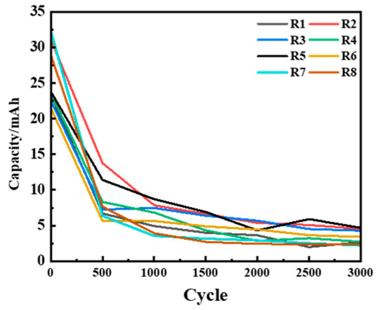 In total, three datasets were used for prediction. The first and second datasets consisted of voltage–time and battery capacity data measured by the device during the battery aging test. The third dataset includes power, cutoff voltage, current, and time data recorded during the LED load experiment. The LED load experiment involved charging the battery with a constant current of 0.5 mA until a cutoff voltage of 4.1 V was reached. In the fully charged state, a 0.06 W LED was used as the load, and data were collected every 0.5 s until the battery was depleted. This cycle was repeated until the battery reached the end of 3000 cycles, marking the conclusion of the experiment. For the battery aging experiment, the battery was charged with a constant current of 35 mA to a cutoff voltage of 4.1 V and discharged with a constant current of 35 mA until the voltage dropped to 2.7 V. This process continued for 3000 cycles, after which the experiment was concluded. Figure 4 illustrates the capacity decay curve for batteries 1–8 during the battery aging test.