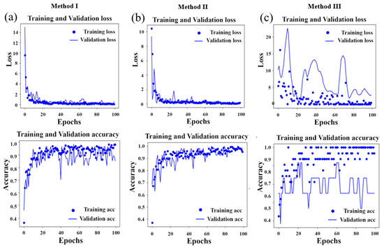 Training and validation losses: training and validation accuracy results obtained by DTL model. (a) Results of Method I; (b) results of Method II; and (c) Results of Method III.