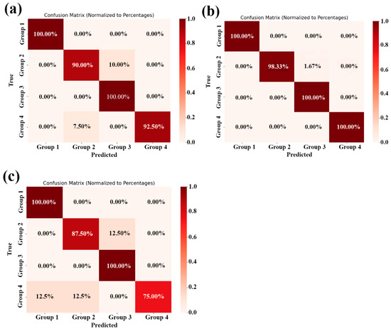 Confusion matrix. (a) Results of Method I, (b) Method II, and (c) Method III.