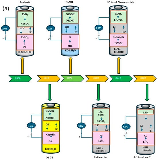 In recent years, lithium batteries have been used as storage devices for “green” sources of energy. The evolution of LIBs is shown in Figure 1a. The range of applications, involving different technologies, including that associated with large electric vehicles like buses, electric cars, and light electric vehicles—electric bicycles, golf carts, small cars, forklifts—demonstrates how vital lithium–ion batteries are in today’s scientific world. They also find application in battery-powered electric instruments such as lawn mowers, electric saws, drills, remote control toys, wind energy storage devices, solar apparatus, warning lights, UPS, small medical appliances, laptops and mobile phones. Two factors make lithium–ion batteries the key player in such applications: their high energy density, possibly as high as 250 Wh/kg or 800 Wh/L, and their flexibility in design, allowing them to be made into various shapes and sizes. These form the very basis on which these batteries are considered an apt choice for such a wide array of devices, in turn fostering more improvement and research in the area of battery technology [1]. Their light-weight design, rapid charging capacity and superior performance compared with other types of batteries keep them at the head of the generation in terms of advanced battery technology.