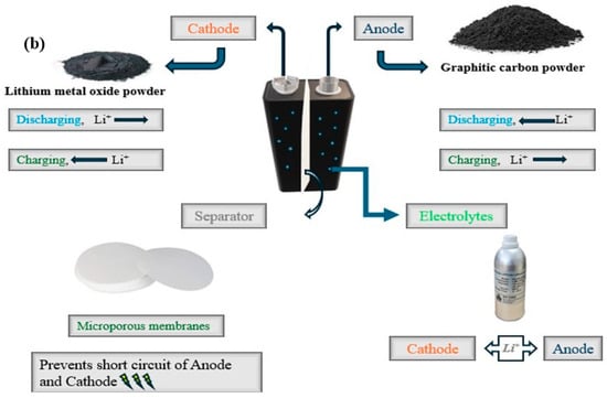 After hydrogen and helium, lithium is the third lightest element, containing just three electrons, and, compared with conventional battery lead and zinc, it has an extremely high energy density. Among all metals, it has the highest specific energy with respect to weight and also the highest electrochemical potential. Furthermore, the molecular mechanisms, such as those concerning the reaction of lithium with carbon into lithium carbonate, are already known [2]. There are three major benefits that lithium provides in battery technology. Firstly, it is very reactive, meaning that, most of the time, it loses its outermost electron, letting the current pass through the battery. Next, it is much lighter than the metals used in any other battery. Thirdly, because lithium has very strong chemical reactivity, it can retain a large amount of energy in its atomic bonds, meaning that a very high energy density is achieved in lithium–ion batteries. Commonly, the main components composing an LIB are the cathode, the anode, the electrolyte, and the separator, as illustrated in Figure 1b. Among these, the electrolyte is an important medium by which to carry Li+ ions during the charge/discharge process [3]. Some constraints may exist for using lithium–ion in batteries, such as the difficulty in recycling it [4], but it nonetheless maintains its supremacy as a battery material.