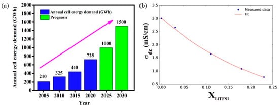 (a) Progress and prognosis of energy requirements from 2005 to 2030. (b) Graph showing ionic conductivity of LiTFSI in Pyr1,4TFSI, plotted against the mole fraction of LiTFSI. Adapted with permission from [33]. Copyright 2015, Wiley.