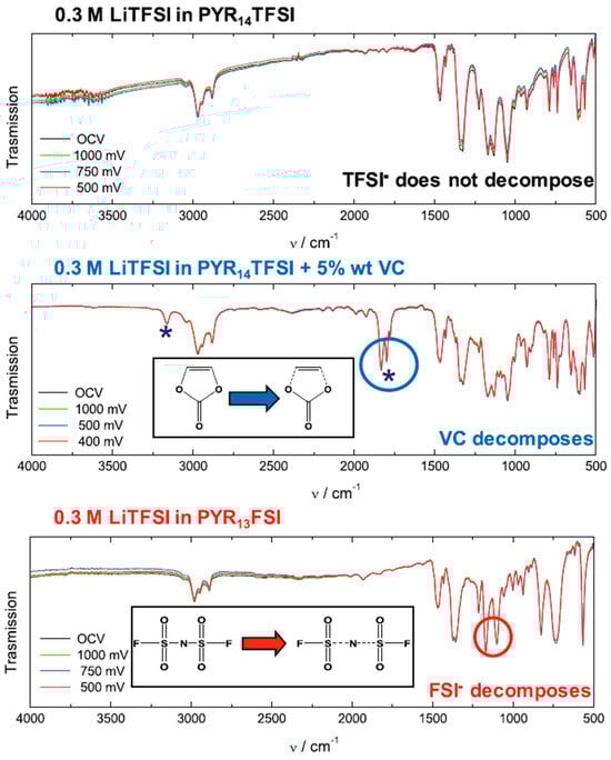 FTIR spectra of pyrrolidinium-based ionic liquids (ILs) frequently employed in lithium–ion batteries obtained in-situ: PYR14TFSI and PYR13FSI. At 500 mV vs. Li/Li+, the TFSI− anion remains stable, while the FSI− anion shows signs of decomposition. Consequently, when using PYR14TFSI with a graphite anode, an additive such as vinylene carbonate (VC) is necessary. In contrast, PYR13FSI can be utilized without any additives due to its inherent film-forming properties. Adapted with permission from [1]. Copyright 2017, Springer.