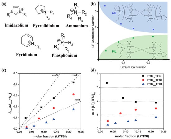 (a) Most commonly used AILs. (b) Impact of the type of IL on lithium–ion coordination in electrolytes based on [TFSI]−. The number of TFSI anions surrounding Li+ is shown by the Li coordination in the figure. Adapted with permission from [49]. Copyright 2021, Elsevier. (c) The ratio of lithium-coordinated TFSI anions as the molar fraction of LiTFSI. (d) The lithium coordination numbers (m) in relation to the molar fraction of LiTFSI for PYR14TFSI, PYRH4TFSI, and PYRHHTFSI. The dashed lines serve as visual guides for the lithium coordination numbers (m). Adapted with permission from [50]. Copyright 2014, Royal Society of Chemistry.