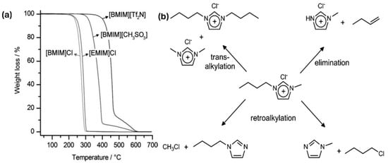 Thermal stability was set in terms of the working temperature of the organic electrolytes in a battery, such as dimethyl and ethylene carbonate and LiPF6, and the hazard of explosion at high temperature owing to their flammability and combustion at around 50–60 °C [94]. Thus, at high temperatures the explosion hazard increases. Their non-flammability is a source of ILs highly thermally stable nature. In other words, they are not easily combustible and/or explosive when acting as a secondary lithium battery in extremely high heat, and would have a high threshold of heat runaway [13]. Xu et al. [13] have indicated that specific ionic liquids (ILs) featuring 1-alkyl-3-methylimidazolium or 1,3-dialkylimidazolium cations can attain thermal stability up to 400 °C. Examples are 1-octyl-3-methylimidazolium hexafluorophosphate ([C8mim]PF6) and 1-hexyl-3-methylimidazolium hexafluorophosphate ([C6mim]PF6), which decompose at 416 °C and 438 °C, respectively, in turn allowing for their application at high temperatures in lithium–ion batteries. In this case, the ILs may withstand extreme temperature conditions without combustion or explosion. Several attempts have been made to establish the thermal stability of ILs by potentiometric titration. Among other results, the thermogravimetric decomposition temperatures of 278 °C for 1-ethyl-3-methylimidazolium chloride ([EMIM]Cl), 291 °C for 1-butyl-3-methylimidazolium chloride ([BMIM]Cl), and 392 °C for 1-butyl-3-methylimidazolium methane sulfonate ([BMIM][CH3SO3]) have been determined (Figure 5a). The mechanistic pathway of [BMIM]Cl is shown in Figure 5b.