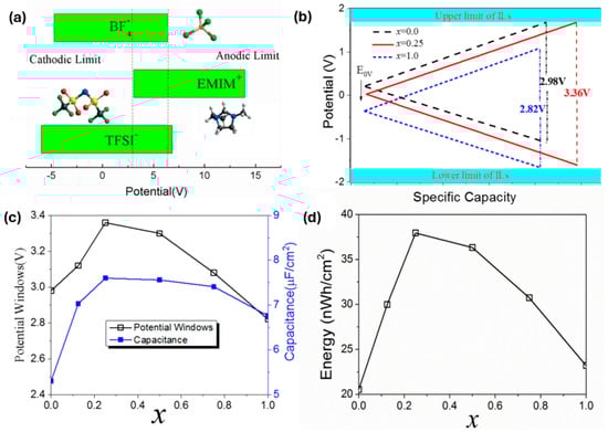 Here, εLUMO and εHOMO are levels corresponding to LUMO and HOMO energies, respectively. The experiment was performed by Cheng using an RTIL mixture of the EMI, TFSI and BF4 ions. Where the cathodic limit and anodic limit are determined using the maximum cathodic limit and minimum anodic limit of each ion. The calculations made in the work by computation are visualized below in the following figures, wherein Figure 6a represents the cathodic and anodic limits of all three ions, Figure 6b represents the potential limit of each electrode having symmetry, Figure 6c shows the effect of RTIL composition mixture on the potential window and the electrochemical double layer capacitance (EDLC), and Figure 6d represents the energy density of EDLC calculated by E = CV2/2 for different mixtures, which clarifies maximum energy density at x = 0.25.