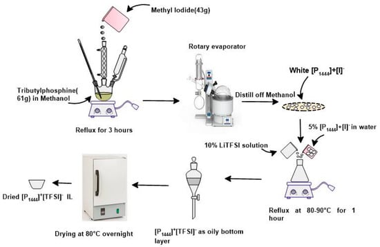 Synthesis of ILs is not a difficult process, but the careful selection and combination of anions and cations are important to obtain a distinctive property required as electrolytes. Some of the important syntheses of widely used ILs are documented in the present review. Barbora Galajdová et al. [3] reported a yield of 84% of methyl tributyl phosphonium bis(trifluoromethyl sulfonyl)imide P1444-TFSI. Methyl iodide (0.3 mol) was added to solution of triphenylphosphine (0.3 mol) in methanol and stirred at room temperature for 3 h followed by distillation of methanol to obtain white solid methyl tributylphosphonium iodide [P1444]+[I]. Later, a 10% aqueous solution of LiTFSI was mixed with 5% solution of [P1444]+[I]− in water, which was then heated at 80–90 °C for an hour before being extracted in a separating funnel with ethyl acetate. The resultant organic layer was rinsed with distilled water and dried at 80 °C to eliminate leftover water and ethyl acetate. The schematic is given below in Figure 7.