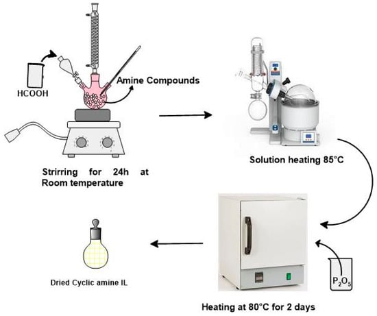 The same study reported the synthesis of trimethyl sulfonium bis(trifluoromethyl sulfonyl) imide [S111-TFSI], with an overall yield of 85%. trimethylsulfonium iodide (0.5 mol) solution with 500 mL distilled water was then mixed with 500 mL of LiTFSI (0.6 mol). The reaction mixture was stirred at 40 °C for 1 h, after cooling and phase separation, the bottom oily layer consisting of [S111-TFSI] was collected, rinsed with distilled water, and dried overnight at 80 °C [3]. Tzi-Yi Wu and co-workers [22] demonstrated the synthesis of cyclic amine-based Bronsted acidic ILs, including the addition of acids (formic acid, trifluoroacetic acid) dropwise to the flask containing amine compounds over 24 h at room temperature, and with a slight excess amine compound used to ensure a proper and complete reaction. The mixture was heated to 85 °C to remove excess amine and water in vacuum using a rotary evaporator and the compounds were heated at 80 °C for 2 days with phosphorous pentoxide P2O5 to remove excess water. The schematic for the reaction is given in Figure 8.