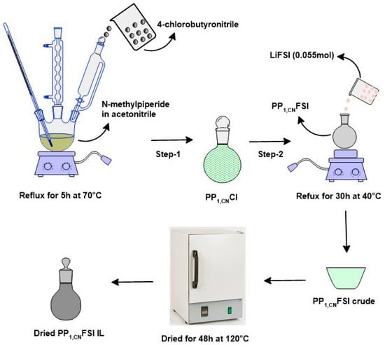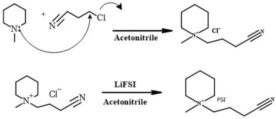 Wenlin Zhang et al. [82] described the synthesis of N-butyronitrile-N-methylpiperidinium bis(fluorosulfonyl)imide (PP1,CNFSI). The method involves two steps as follows: first, the synthesis of PP1,CNCl and, second, the synthesis of PP1,CNFSI by the anion exchange method. 4-chlorobutyronitrile (0.1 mol) was mixed with N-methylpiperidine (0.1 mol) in acetonitrile (100 mL) and stirred using a magnetic stirrer for 5 h at 70 °C to yield PP1,CNCl. Then, PP1,CNCl (0.05 mol) and LiTFSI (0.055 mol) were mixed with 100 mL acetonitrile and refluxed at 40 for 30 h to yield PP1,CNFSI, the resulted solution was dried in vacuum at 120 °C for 48 h to obtain colourless IL. A schematic of the synthesis of PP1,CNFSI is given in Figure 9 and the mechanism for the above reaction is shown in Figure 10.