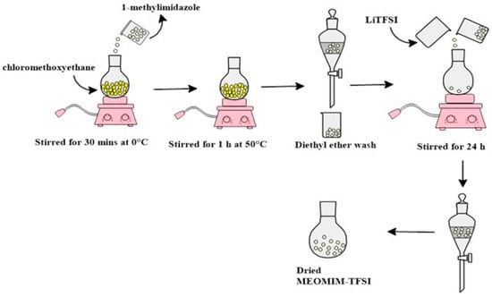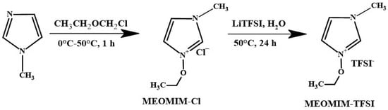 The synthesis of MEOMIM-TFSI was performed by mixing lithium bis (trifluoromethanesulfonyl) imide (81 mmol) to the prepared MEOMIM-Cl (85 mmol) and then stirring for 24 h. The organic layer product, as extracted using the solvent dichloromethane, contains the MEOMIM-TFSI IL [118]. The reaction scheme for the above reaction is given in Figure 12.