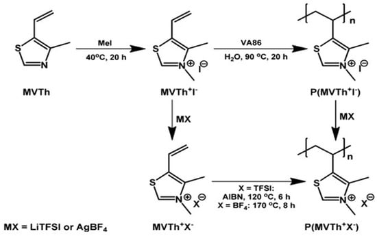 - Grygiel, K.; Lee, J.-S.; Sakaushi, K.; Antonietti, M.; Yuan, J. Thiazolium Poly(Ionic Liquid)s: Synthesis and Application as Binder for Lithium-Ion Batteries. ACS Macro Lett. 2015, 4, 1312–1316. [Google Scholar] [CrossRef]
