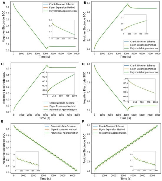 The solution of various solvers for the PDE about the lithium diffusivity in the solid electrode region for (A) a negative electrode and (B) a positive electrode under discharge–rest, (C) a negative electrode and (D) a positive electrode under charge–rest, and (E) a negative electrode and (F) a positive electrode under HPPC cycling steps.