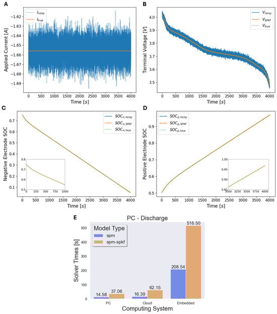 Research works have employed non-linear Kalman filters on the state–space representations of the continuum-scale battery models for battery cell state estimations in practical applications [45,46]. Kalman filters, which come under the domain of sequential probabilistic inference, find the efficient estimation of the system (for, e.g., the SOC of positive and negative electrodes) using the prior estimates while considering the randomness of the system’s process and sensor noises. The sigma-point non-linear Kalman filter (SPKF) is suitable for non-linear models (as is the case of the battery models in this work) since (1) it does not require the calculation of the derivatives and (2) it samples the strategic points in the probability distribution function of the state and output equations [47]. The state–space representation contains the state and output equations as defined below [47].