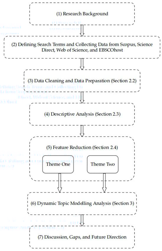 This section presents a refined methodology framework for conducting a systematic literature review in Figure 1. The framework consists of seven key steps: (1) establishing the research background to provide context and direction for the study, (2) defining precise search terms and collecting relevant data using advanced search functions in Scopus, Science Direct, EBSCOhost, and Web of Science, ensuring comprehensive coverage of peer-reviewed literature, (3) data cleaning and data preparation, (4) a descriptive analysis is presented to offer key insights and an overview of the subject area, (5) the feature reduction for selecting the most relevant terms in the text data, aiding in clearer and more efficient data analysis, (6) a DTM analysis is used to analyse and track how topics evolve over time within a collection of documents, and (7) we synthesise findings in the discussion, identifying gaps, and providing future research directions. This structured framework ensures a thorough exploration of the research landscape, leading to meaningful insights and recommendations.