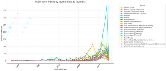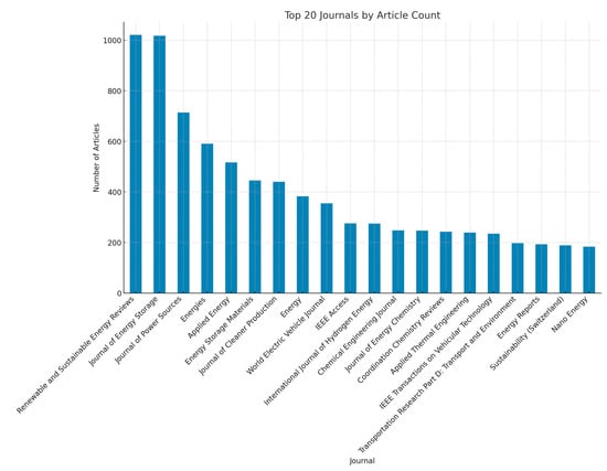 Figure 4 highlights publication trends across the top 20 journals, with Renewable and Sustainable Energy Reviews and Journal of Energy Storage leading in renewable and storage research. Journal of Power Sources maintains a steady presence with foundational contributions to battery and EV technology, while Energy Storage Materials and World Electric Vehicle Journal show recent growth, reflecting increased demand for specialised research. Broad-impact journals like Applied Energy and Energies align with the global shift to renewables, while interdisciplinary journals such as IEEE Access, International Journal of Hydrogen Energy, and Journal of Cleaner Production bridge engineering and environmental science. Emerging journals like Nano Energy focus on advanced materials, showcasing the field’s dynamic evolution towards cutting-edge EV and battery solutions.