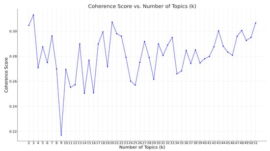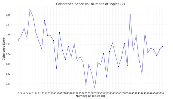 To find the optimal number of k, ref. [4] proposed a coherence score, which becomes one of the most popular methods to identify k in topic modelling. We used the Python Gensim package. For each potential k value, the model calculates the coherence score, which measures how well the words in each topic are semantically related. The k value with the highest coherence score generally indicates the best model. The DTM model with the k having the highest coherence score will be selected as the optimal number of topics for the dataset. We trained DTM in a loop with k values from 2 to 52; according to [5], 50-loop is the most reasonable value for k. Figure 5 and Figure 6 are the results for Theme 1 and Theme 2.