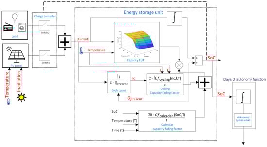 - LiC energy storage is demonstrated in Figure 1, and its State of Charge is described by Equation (2). This model takes two inputs, the storage power feed and panel temperature, and yields one output, the SoC. Temperature plays a significant role in influencing the storage capacity, as will be detailed in Section 4: