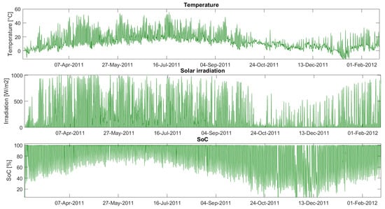 Figure 2 presents an illustrative depiction of the variation in the supercapacitor’s over the course of a year, influenced by fluctuations in irradiation and temperature. While Figure 2 does not precisely align with the subsequent scenarios under discussion, it provides qualitative insight into the dynamics of the SoC, notably emphasizing the reduced SoC levels during winter months (i.e., that the maximum depth of discharge considered in this study is 100%), attributed to the effects of rainy days and decreased irradiation and temperature (e.g., low irradiation, as depicted in Figure 2 toward the end of September).