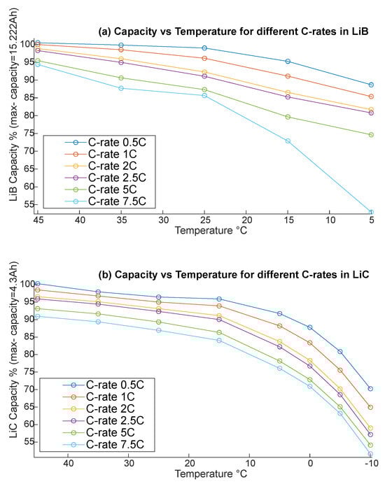 Observations indicate that the LiB’s capacity for a low discharging current (0.5 C and 1 C) and from 25 °C to 55 °C shows minimal dependency on the measurement conditions [6] while other higher discharging currents have some capacity loss (indicating that the capacity decreases between 88% and 52% for 7.5 C in temperatures between 15 °C and 5 °C) [6]. However, the LiC has a more stable capacity in low temperatures (even at <0 °C). As shown in Figure 3b, the LiC capacity dropped to half of its at −10 °C and a rate of 7.5 C, while in Figure 3a, LiB had a 50% capacity drop at only 5 °C for the same C-rate [6].