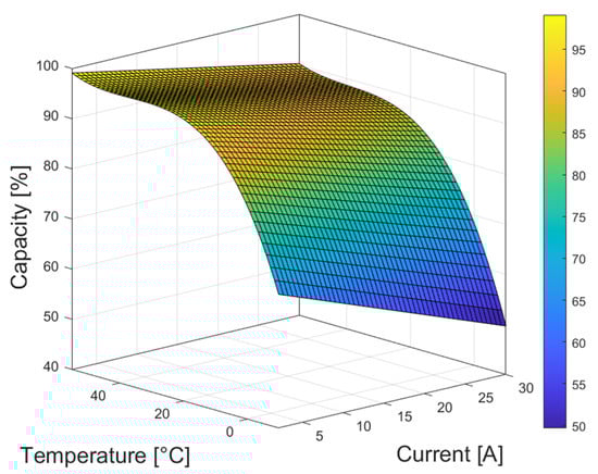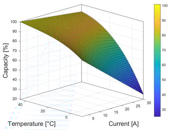 The obtained capacity dependency on current and temperature is presented in Figure 4 for the LiC and in Figure 5 for the LiB, where it provides an extrapolation to the data presented in Figure 3. These capacity-dependence curves are used in the ES models.