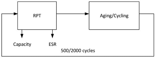 An aging model was developed for both the LiC and LiB. For the LiC, results were obtained from performing accelerated cycling aging tests for up to 21,500 cycles (4500 cycles for 1 C, 14,500 cycles for 4 C, and 21,500 cycles for 7 C). After every 2000 cycles, reference performance tests (RPTs) were carried out where the capacity and the equivalent series resistance (ESR) were measured, as shown in Figure 6. Five LiC cells were tested on a 3 × 3 test matrix with two axes representing temperature and the C-rate, as shown in Figure 7 [7].