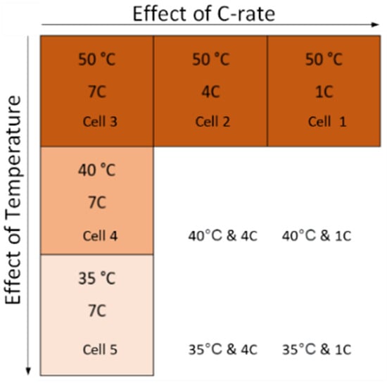 Test matrix of the cycling aging conditions for five LiC cells, considering the dependence on C-rate and temperature.