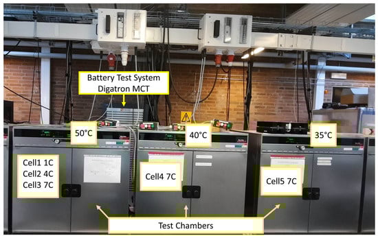 The laboratory setup for conducting these tests is demonstrated in Figure 8. This setup features three Memmert temperature chambers, each set at distinct temperature levels of 50, 40, and 35 degrees Celsius. Inside these chambers are the five LiC test cells under examination. The different C-rates (1 C, 4 C, and 7 C) were applied through channels emanating from the Digatron battery test system.
