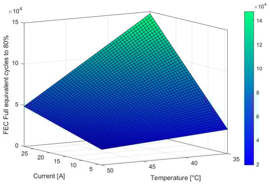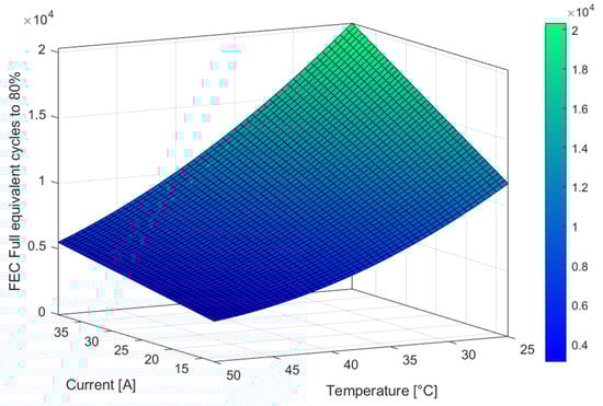 For the LiB, lifetime results were obtained from the literature that studied this particular battery cell [28]. Thus, the capacity fade estimation model is given by (6) and (7). is the estimated FECs number that the LiB can withstand at various currents and temperatures before reaching the 20% capacity fade (end of life), which is presented in Figure 10: