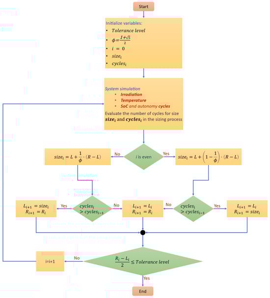 Golden Section Search algorithm used for optimizing energy storage size to maximize autonomy cycles.