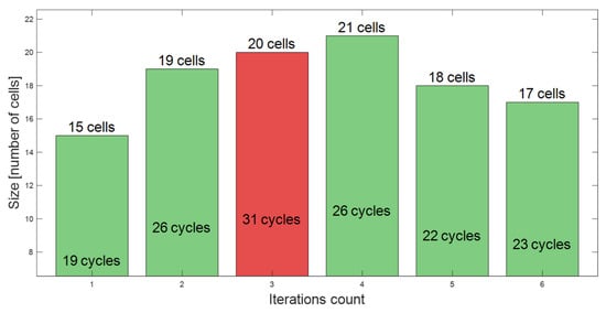The iterative sizing process, using the Golden Section Search algorithm, is illustrated in Figure 13. This approach is designed to optimize the number of LiC cells to maximize autonomy cycles for the one day of autonomy, dynamic temperature, and dynamic load scenario. The figure presents the iteration count and the size in terms of the number of cells. Each bar in the chart represents an iteration that is labeled with the achieved number of autonomy cycles. System simulations are conducted for different cell sizes during this optimization process, with the algorithm suggesting the next cell size for testing based on the current number of autonomy cycles. Following this method, the optimal size was found to be 20 LiC cells at the third iteration as it achieves the highest number of autonomy cycles, while the total number of iterations was six.