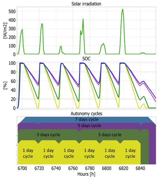 In Figure 14, the concept of autonomy cycles is shown. The one-day autonomy cycle is the cycle between two consecutive 0% SoC, where the one day of autonomy, according to the algorithm in Figure 12, requires a storage size that maximizes the number of autonomy cycles while exceeding the optimal size, which will reduce the number of autonomy cycles as the duration between the two consecutive 0% SoC will take more time than 24 h. The figure also presents the size for the three-day cycle, five-day cycle, and seven-day cycle. The figure also shows the four sizes at the same specific time of the year, which does not necessarily represent the exact autonomy cycle and can exceed such as in the three-day cycle and five-day cycle.