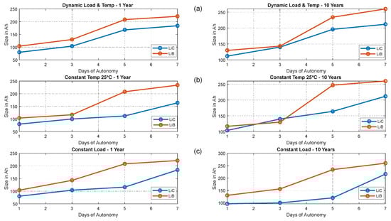 Sizing of LiC (left) and LiB (right) for one, three, five, and seven days of autonomy and 1 to 10 years of operation. (a,b) for the dynamic load and temperature, (c,d) for the constant temperature at 25 °C, and (e,f) for the constant load.