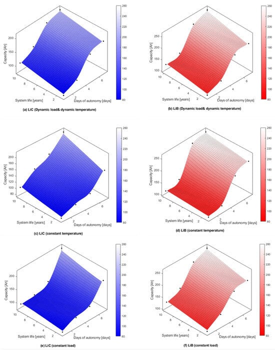- In the dynamic temperature and load scenario, the LiC’s storage capacity was sized to be, on average, 80.24% of the LiB’s for a 1-year sizing (without considering capacity fade), as depicted on the left side of Figure 15a. In the 10-year sizing, the LiC’s relative sizing increases to an average of 87.34% of the LiB’s, as also illustrated on the right side of Figure 15a. In Figure 16a,b, a representation of a 3D interpolation of the LiC and LiB sizing capacity depending on the system lifetime and days of autonomy in the dynamic temperature and load scenario is depicted. Considering capacity fade after 10 years, the average sizing increase in the LiC ES was 26.6%, while the size of the LiB increased by an average of 16.2%, as shown in Table 2 and Figure 16a,b.