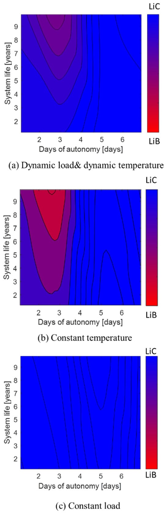 Under a constant-temperature scenario (b), the LiB surpasses the LiC at three days of autonomy for system lifespans beyond five years, yet the LiC maintains superiority in all other conditions.