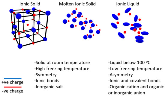 Ionic liquids (ILs) are a group of liquid organic salts characterized by certain properties that have motivated researchers to investigate their potential applications in various fields [27,28]. The asymmetrical and bulky structure of constituent ions in ILs differentiates them from conventional salts such as sodium chloride and even molten salts, as depicted in Figure 2 [29,30,31]. Conventional salts have tightly packed symmetrical ions that exhibit stronger ionic interactions leading to higher melting points compared to ILs. ILs boast a range of significant properties, including non-volatility, low vapor pressure, non-flammability, wide electrochemical stability windows (ESWs), high thermal stability, and good electrical conductivity [27,32,33]. The exceptional properties of ILs, specifically their non-volatility and high ionic conductivity, have been utilized in electrochemical applications. They are good candidates for safe electrolytes in a wide range of energy storage devices, such as batteries and supercapacitors. Moreover, their ability to dissolve a wide range of organic compounds and metals makes them suitable as solvent media [34]. Furthermore, ILs exhibit high ionic conductivity and strong electrostatic interactions making them promising electrolytes in battery technology [34]. Additionally, ILs can be transformed into ionic liquid gels (ionogels) which offer notable advantages, such as high conductivity, and can be considered a method for solidifying ILs without using their lubricant properties [35]. To capitalize on these benefits, Lee et al. utilized a hybrid ionogel in the development of a lithium battery [36]. However, one of the most common problems associated with ionogels and ILs is corrosion, especially when used as solid electrolytes in solar cells, batteries, capacitors, and soft actuators, as well as in their application as lubricants. To address this issue, Yu et al. used urea to obtain a gelator as an ionogel material and showed good anticorrosion properties with copper pieces [35]. This can be ascribed to the ability of the gelator to form bonds with the metal surface which works as a protective film and prevents corrosion. Another problem associated with some ILs is their extreme sensitivity to water. Even a small amount of moisture from the air can cause them to break down and generate hydrochloric acid (HCl), which is a corrosive and undesirable byproduct [37]. This sensitivity to water can be a significant problem in battery systems as ILs can cause damage to typical current collector materials, such as copper, nickel, and even titanium. When these metals are exposed to the ILs, they may corrode or undergo decomposition, which can weaken the overall performance and longevity of the battery [38]. Furthermore, ILs possess weak ionic conductivity at ambient temperatures and insufficient solubility of non-organic salts, which can adversely affect energy performance. To address these challenges and provide alternative electrolytes that are safer, less expensive, offer high ionic conductivity, better chemical compatibility with cell components, and can work well at room temperature, researchers have developed deep eutectic solvents [39,40].