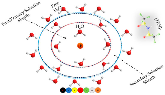 Lithium bis(trifluoromethane sulfonyl)imide (LiTFSI) and zinc bis(trifluoromethane sulfonyl)imide (ZnTFSI) are inorganic salts with the chemical formulas of LiC2F6NO4S2 and Zn(C2F6NO4S2)2, respectively [55]. Despite sharing similar physicochemical properties, LiTFSI exhibits several advantages due to its use in Li batteries and its use in combination with urea [56]. Both are white hygroscopic powders [57,58]. LiTFSI has some interesting properties, such as relatively good ionic conductivity around 2.80 mS·cm−1 as electrolyte and 0.0011 mS·cm−1 for LiTFSI itself without any solvation effect, thermal stability around 200 °C, and electrochemical stability which reaches 4.5 eV [59,60,61]. An increase in LiTFSI concentration to 21 M resulted in an expansion of the electrochemical stability window to approximately 3.0 V, as reported previously [19,54]. LiTFSI is a soluble and hydrolysis-resistant salt that was selected as the electrolyte solute [62]. In dilute electrolytes, Li-ions are effectively solvated in the primary solvation sheath which provides adequate mobility and prevents aggregation [63]. Further, in dilute electrolytes, there is sufficient water to dissolve all the salt; thus, every Li-ion is surrounded by a cluster of water molecules that are bound tightly with Li+ ions via electrostatic interaction from partial negativity of oxygen, as shown in Figure 4. This leads to sheaths or shells that are crucial for preventing interactions between the ions. The function of the shells is not only to act as a shield but also as ionic carriers. Water molecules can carry Li+ ions and facilitate the movement in the solution, which leads to an efficient transportation process. The sheath also prevents the aggregation and clustering of ions by hindering their mobility. Therefore, a well-hydrated primary solvation sheath is crucial for the electrochemical properties of the electrolyte. One study revealed that a specific molar ratio of 1:3.6 between LiTFSI and urea resulted in ionic conductivities ranging from 10−4 to 10−3 S cm−1 at temperatures between 300 and 330 K [64]. The eutectic melting temperature was determined to be 240 K, while the individual melting temperatures of LiTFSI and urea are 507 and 405 K, respectively [65].