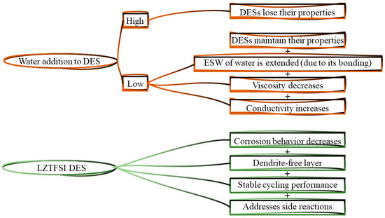 The performance of LiTFSI/urea was even investigated in non-DES systems or conventional aqueous systems such as a LiTFSI-H2O-PEG-urea electrolyte with an anode and cathode of Li4Ti5O12 (LTO) and LiMn2O4 (LMO). In this system, an irreversible plateau was observed in the first cycle. However, this plateau gradually disappeared completely by the 11th cycle. This can be ascribed to the formation of a passivation layer on the electrodes which can resist the decomposition of aqueous electrolytes [66]. Additionally, at charging and discharging voltages of 1 and 3.1 V, respectively, the specific capacity observed was approximately 160 mA·h·g−1 during the initial cycle. Nevertheless, this capacity decreased to around 150 mA·h·g−1 by the 11th cycle and declined further to 80 mA·h·g−1 after approximately 60 cycles, eventually reaching 40 mA·h·g−1 after 180 cycles. Despite this decrease in capacity, the Coulombic efficiency (C.E) was maintained at around 92% [66]. However, in this conventional aqueous electrolyte system, it is important to understand the effect of urea addition to electrolytes. In this aqueous electrolyte, the electrochemical window is extended despite the existence of water, which can be attributed to the hydrogen bonding between urea and Li+, in addition to water with PEG, which restricts the activity of water [66]. When Zn(TFSI)2 is added to the electrolyte, the resulting component is LZTFSI-urea. This component comprises two reactive ions, Li+ and Zn2+. The appropriate ratio for obtaining LZ-DES is Li/Zn of around 20, while the molar ratio of Li/urea is between 1:3 and 1:3.8. The conductivity of this system was around 0.084 mS/cm at a ratio of 1:3 and a temperature of 30 °C [67]. Zhao et al. added H2O to the DES system with a molar ratio of 2 (LZ-DES/2H2O). This addition increased conductivity and decreased viscosity to 1.85 mS/cm and 0.139 Pa·s at 30 °C, respectively [67]. The usage of the Zn(TFSI)2 DES system can aim also to address the side-reaction challenge of Zn aqueous and dendrite formation, as shown in Figure 5. That is clear in the paper, where a dendrite-free layer was obtained after around 40 min at 0.2 mA·cm−2. Moreover, the water in LZ-DES led to a decrease in the corrosion behavior [67]. The electrochemical cell using LZ-DES/2H2O initially underwent a 30 h induction period after which it consistently cycled over 2400 h (equivalent to 3.3 months) without notable overpotential. This means that after an initial phase of stabilization, the cell continued to operate smoothly and, without water, exhibited the same stable cycling performance but with less amplified polarization. It has also been reported that regular aqueous electrolytes are highly sensitive to the operating rate, leading to early failures in their cells, sometimes within just 20 h (first cycle). In the case of LZ-DES/2H2O, the cycling of Zn plating and stripping remains stable even after 400 h, displaying consistent voltage responses in each cycle [67]. Sim et al. added PAN-DMF to a LiTFSI-urea DES which enhanced conductivity at ambient temperature from 2.54 × 10−4 to 3.82 × 10−3 S·cm−1 from PAN-DMF-LiTFSI to PAN-DMF-LiTFSI-urea [68].