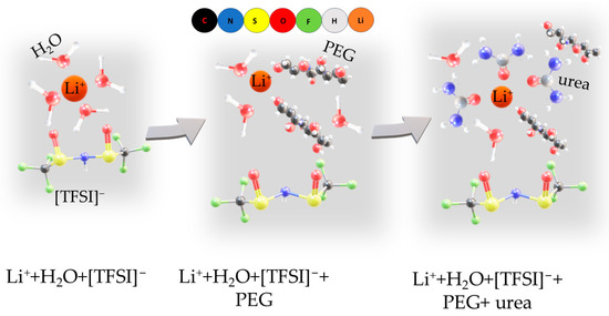 The strong electrostatic interactions between Li+ and the oxygen atoms of urea and TFSI were found to be the primary cause of the observed stability. It has been hypothesized that the presence of highly polar Lewis bases, such as urea, which act as electron donors and effectively counteract the electrostatic interactions between Cat+ and X, may facilitate the gradual replacement of TFSI ions with urea molecules in the first coordination shell around lithium ions leading to the formation of DESs at a certain molar ratio [69]. An analysis of the radial distribution function (RDF) between Li+ ions and H2O in the non-DES electrolyte of LiTFSI-H2O-PEG-urea revealed a distinct peak at 2 Å, signifying close coordination in the first coordination shell [66]. In contrast, the RDF between Li+ ions and TFSI exhibits a peak around 4.5 Å, designating a secondary coordination shell. This means that H2O is predominant in the primary coordination shell surpassing the involvement of TFSI. Despite the coordination structure of [Li (H2O)3(TFSI)], indicating a 25% occurrence belonging to TFSI, water molecules constitute 86% of the occurrence in the first shell. Consequently, a higher concentration of TFSI compared to H2O may result in the prevalence of TFSI around Li+. Furthermore, the introduction of PEG contributed to a reduction in the occurrence of H2O in the first shell by 7% and around 3% for TFSI, replaced by PEG. The PEG molecules envelop the central Li+ with multiple bonds playing a crucial role in impeding H2O molecules from entering the primary coordination shell of Li+, as depicted in Figure 6. This leads to a configuration where 79% of the water molecules surround the first coordination shell. Moreover, urea exhibits a greater affinity for coordination with Li+ compared to PEG. In this system, the occurrence of in the first shell is approximately 36%, while PEG is around 7%, indicating that urea displaces PEG around Li+ ions from the first to the second shell and bulk [66]. That means urea tends to be in the first solvation shell around Li+ in the aqueous system. Moreover, Nandy et al. investigated a urea-LiTFSI DES and showed that, for the lowest urea mole fraction, there is a comparable binding strength to Li+, indicated by the calculated value of the minimum potential of mean forces (PMF) by an MD simulation in the system of Li+[(TFSI)x (urea)4−x] [69]. This implied a moderate binding affinity for both components. As urea concentrations increased, there was a decrease in the minimum PMF for TFSI, whereas a slight increase was observed for urea. Consequently, an increase in urea concentration strengthens the Li+-TFSI coordination shell, while the binding energy between urea and the Li+ remains almost unchanged [69]. In addition, the coordination numbers for urea and TFSI- around the Li+ have been calculated and investigated. Around the Li+, the closest coordination shell includes at least one urea molecule due to shorter nearest-contact distances between urea molecules and Li+ compared to TFSI ions in the DES as well as in conventional aqueous systems, which has been discussed before. Therefore, urea molecules dominate the local environment around Li+ ions, signifying the gradual replacement of TFSI for urea from the first coordination shell around the Li+ [65]. Therefore, a steady rise in the coordination numbers attributed to urea, while the coordination numbers related to TFSI ions exhibit a consistent decrease. This encourages urea to play its role as a donor and Li+ as an acceptor, leading to DES formation at certain ratios of urea: LiTFSI. Lesch et al. noticed that RDF between urea, LiTFSI, and Li depends on the quantity of urea in the system [65]. The most calculated stable structure belongs to Li+[(TFSI)x (urea)4−x] due to the lower H U M O and L U M O energies, which indicates the electrochemical stability window. That means the highest electron affinity structure [69]. This suggests the formation of a LiTFSI-urea DES induces dissociation which results in the separation of Li+ cations and [TFSI] anions Li+[(TFSI)x (urea)y] [69]. The introduction of urea weakens the ionic bonds between the Li+ and TFSI, with the formation of hydrogen bonds between urea and the TFSI [65,69]. In addition, the presence of water molecules can further disrupt the Li+-TFSI interactions and establish hydrogen bonds with both TFSI and urea [67]. This behavior is similar to the water behavior with PEG in the aqueous electrolyte, which leads to an extension of the electrochemical window. Furthermore, urea is a Lewis base due to the presence of lone pairs on its nitrogen and oxygen atoms that can form bonds with Li+ [69]. Finally, urea molecules are smaller than TFSI anions, which leads to greater mobility of urea within the DES. This enhanced mobility might lead to lower viscosity, higher diffusion for Li+ ions, and higher ionic conductivity [67]. However, it is crucial to reach a balance between urea and TFSI ions to optimize the urea concentration and maximize electrolyte performance.