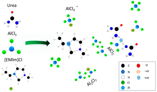 According to the study conducted by Jiao et al., the reaction between AlCl3 and urea takes place in three distinct stages [50]. The first stage is between urea and A l C l 3 (Equation (1)).