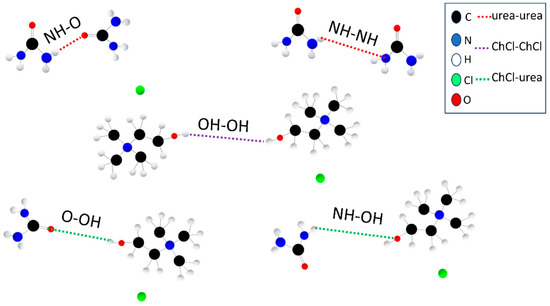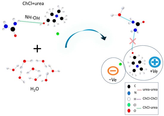 When water was introduced into this system, it had a direct effect on the dissociation of ChCl with Ch+ cations and Cl anions. Water molecules can form hydrogen bonds with urea via NH-OH bonds. This interaction occurs instead of ChCl or by replacing the ChCl position with urea, leading to a higher degree of ionic dissolution for ChCl. Therefore, the presence of water in a ChCl-urea DES means that water forms hydrogen bonds with urea, which enhances the ionic dissociation of ChCl, as shown in Figure 9 [90].