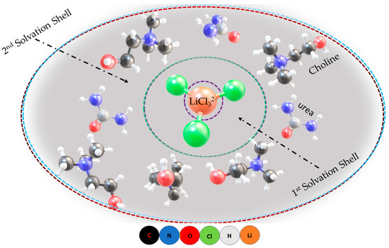 Theoretical studies have investigated the local environment of ChCl-urea-LiCl and found that L i + ions in the electrolyte coordinated with Cl anions, forming Li C l 3 2 units [92]. Each lithium cation in the electrolyte is closely surrounded by three chloride anions, forming a flat triangular structure which is the Li C l 3 2 unit. These Li C l 3 2 units are surrounded by urea which forms an intricate network of hydrogen bonds [92]. The interaction between lithium and urea or choline is indirect and mediated by the chloride due to these species being in the second coordination shell of the lithium, as shown in Figure 10 [92].